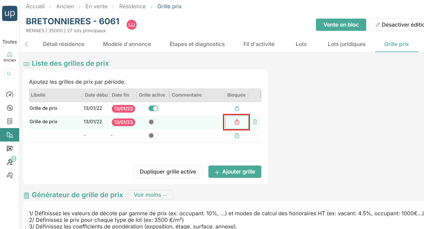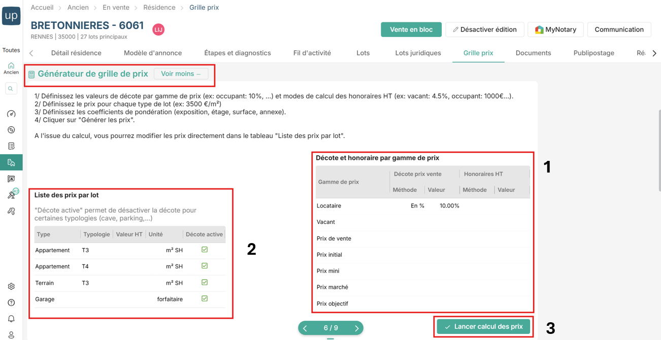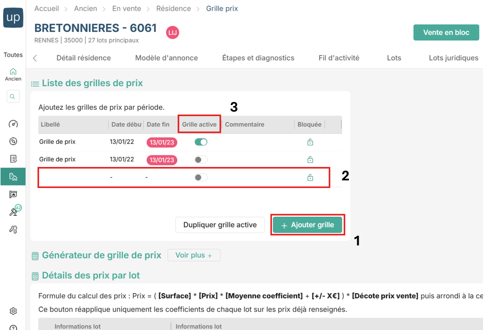 L’application offre la possibilité à l’utilisateur de générer automatiquement des grilles de prix en fonction des caractéristiques des logements de la résidence.
