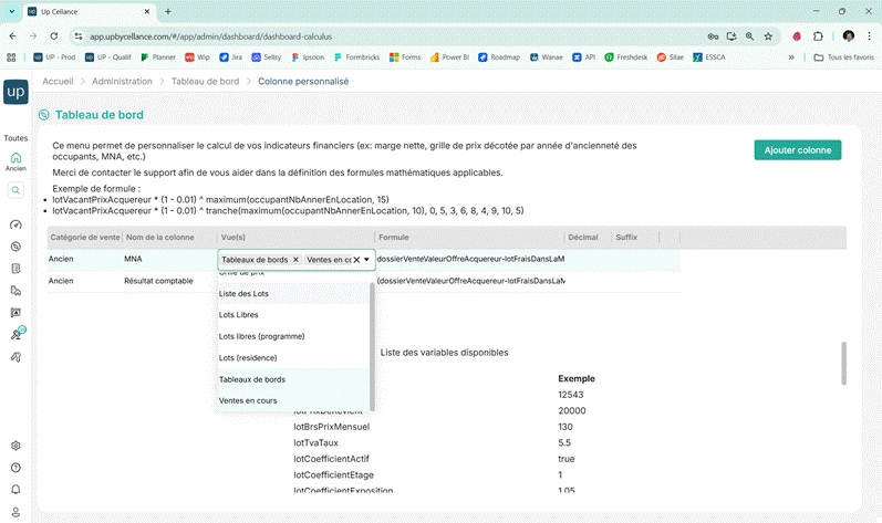 Vue(s) : où cette colonne doit apparaître (ex. : Tableaux de bord, Liste des lots...)