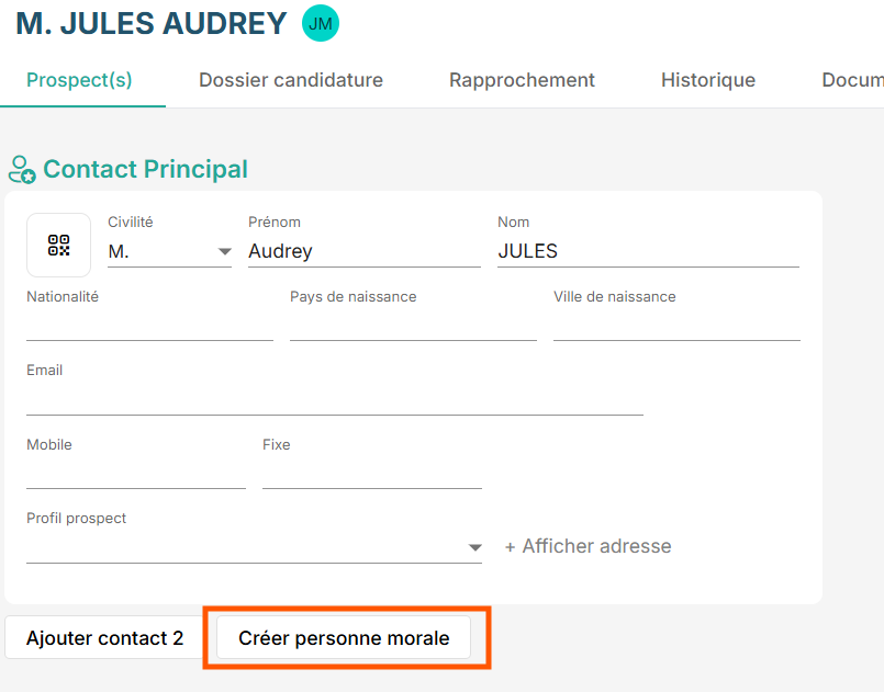 - Le renvoi permet d’accéder à la fiche prospect pour créer une personne morale (image 2)