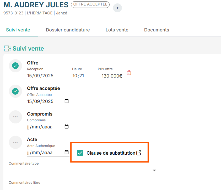 Image 1 : Coche « clause de substitution » dans le dossier de vente.