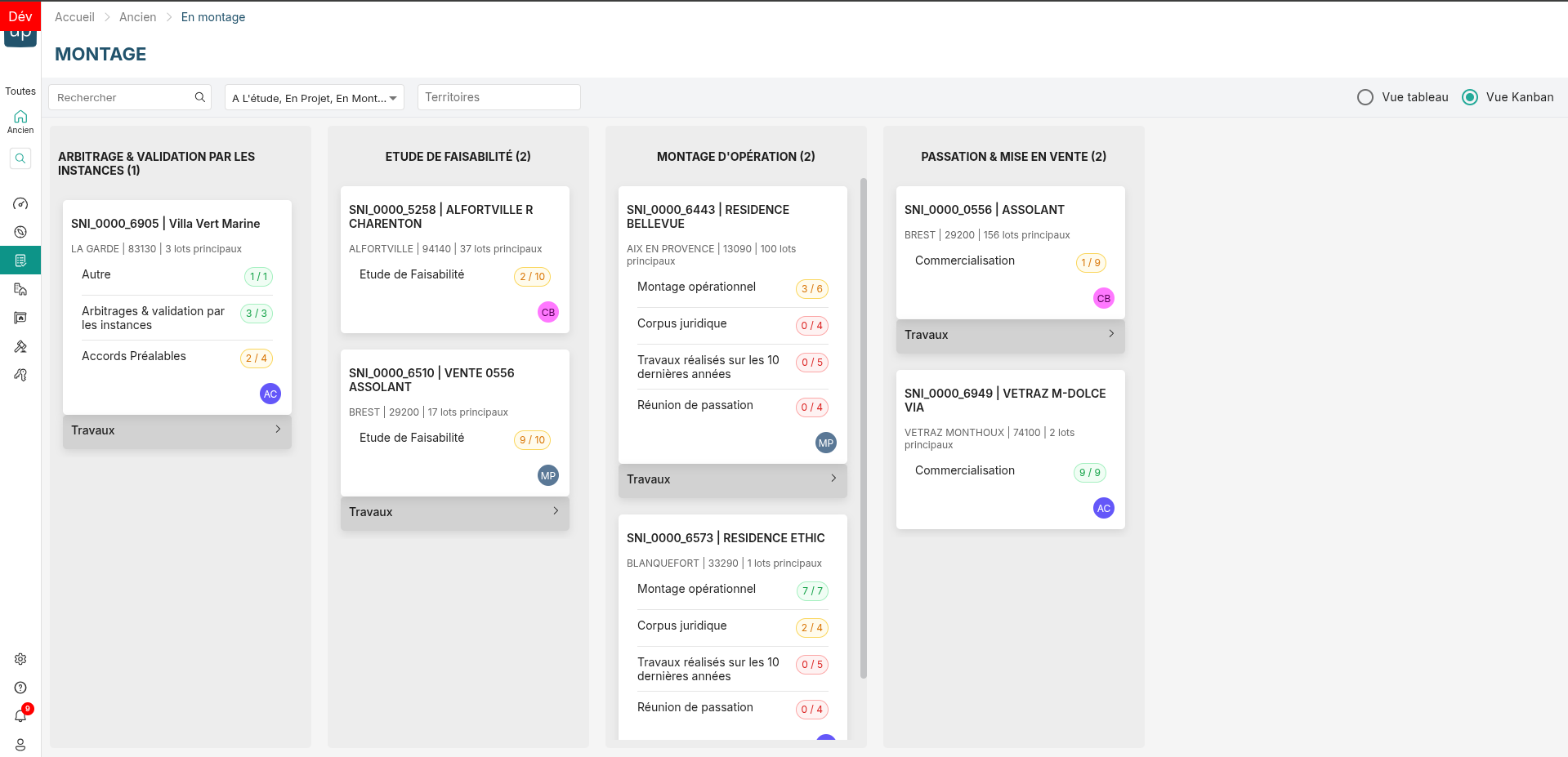 Une fois cela fait, le Kanban s'affiche. Les résidences sont organisées dans les différents groupements créés dans le paramétrage.