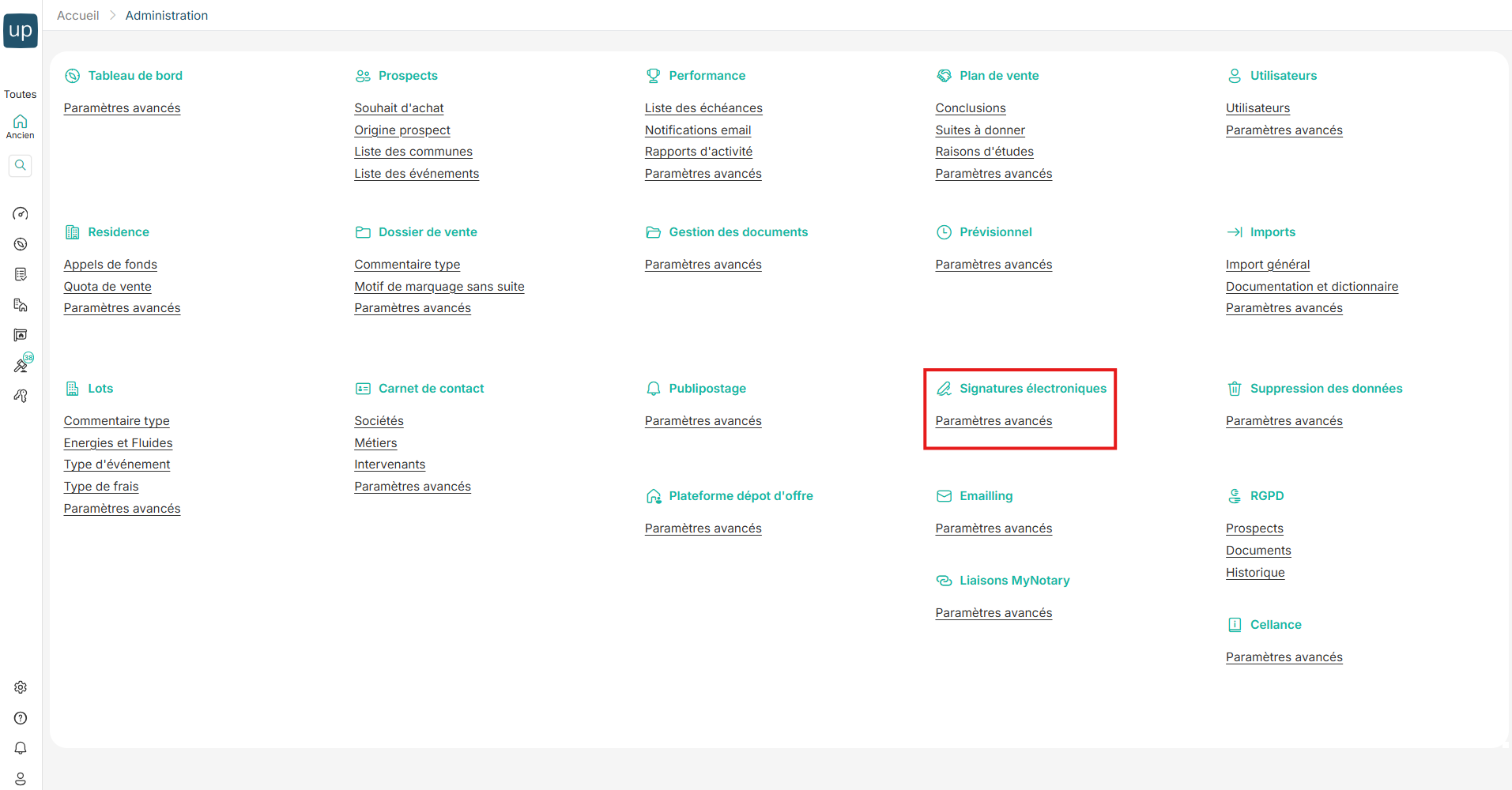 Le paramétrage des signatures électroniques se déroule dans l'administration, menu "Signatures électroniques".