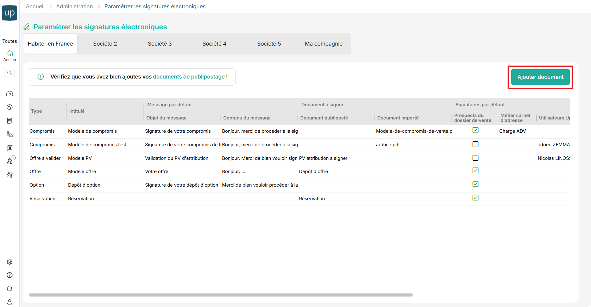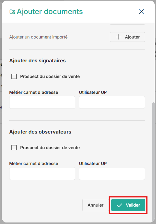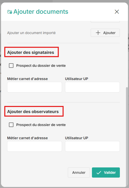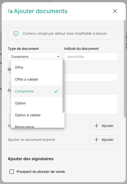 - Prospects du dossier de vente : cochée, cela ajoute automatiquement les prospects acquéreurs du dossier sur lequel vous créez une signature.