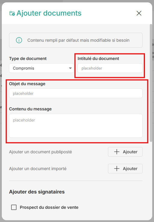 Un document publiposté doit être paramétré en amont. Voici comment faire ici.L'ajout d'un document importé (fichier fixe depuis votre ordinateur) permet l'ajout d'un document sans variables de remplacement, non personnalisé.